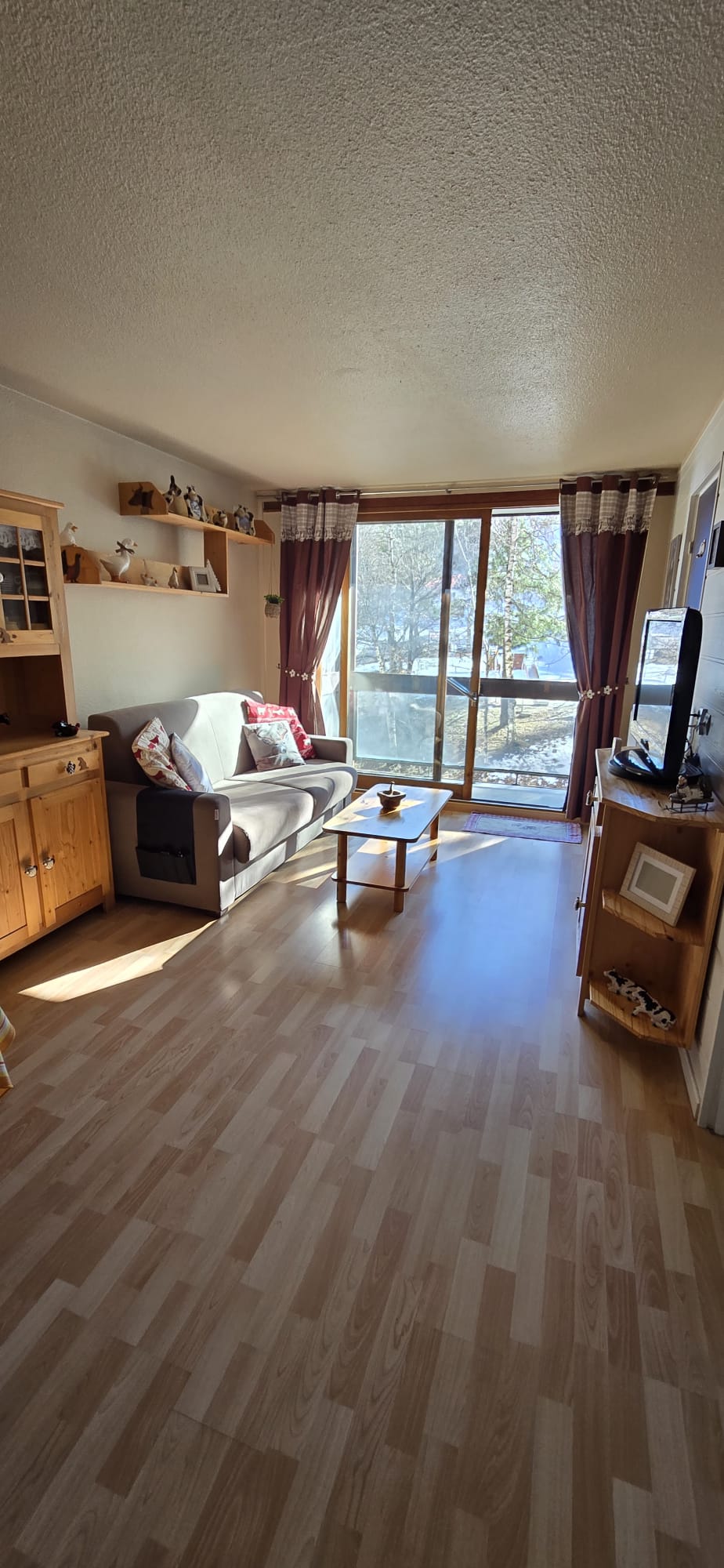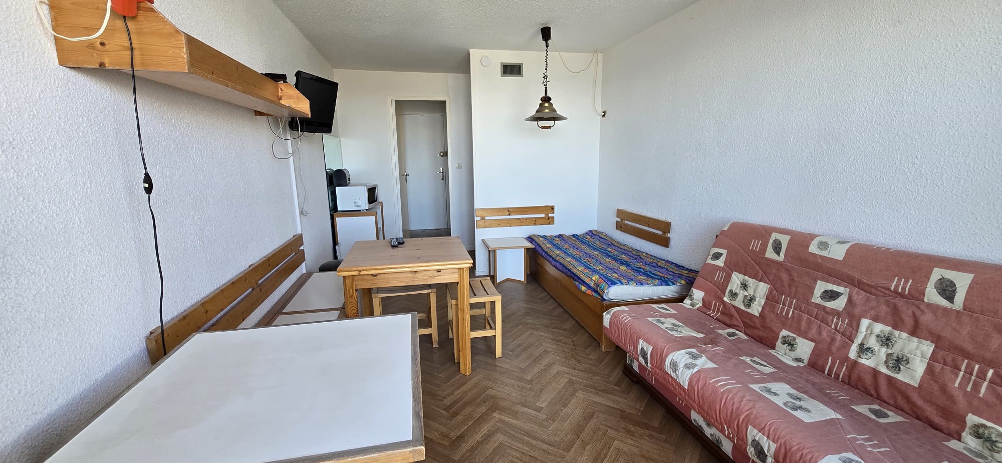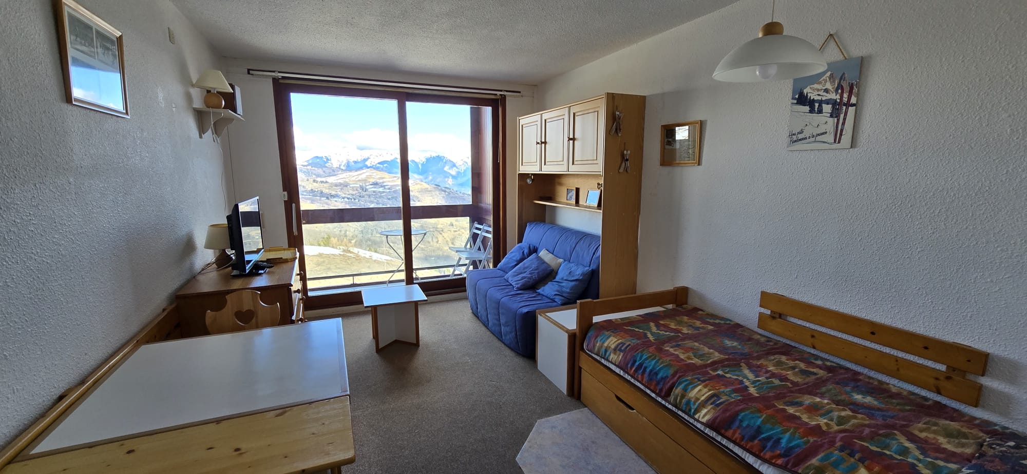 Le studio est équipé de volets électriques et baies vitrées en aluminium, et est composé d’une belle entrée avec grand placard, d’une SDB avec baignoire et WC, d’une cuisine équipée et ouverte sur le séjour, un séjour avec 4 couchages et balcon vue sur la vallée et un casier à skis au SS de la résidence.
